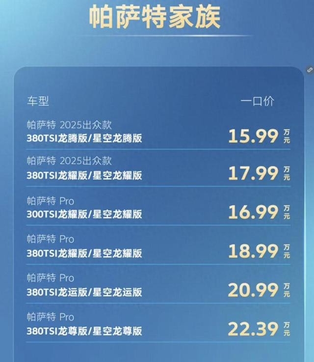 作为隔壁老王,一个在汽车行业摸爬滚打二十年的老司机,今天我要好好聊聊2025款大众帕萨特。说实话,帕萨特这个名字在中国市场已经响了二十多年,从最早的“官车”形象到如今的家商两用标杆,它始终是B级车市场里绕不开的选择。而2025款帕萨特,尤其是这次限时一口价15.99万起的380TSI龙腾版,更是让我这个老德系粉又爱又恨——爱的是它依然保留了德系车的扎实功底,恨的是它居然把价格打到了国产车的区间,这让隔壁刚提了雅阁的老李情何以堪?